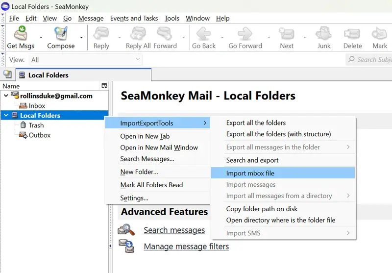Βήμα 3: Εισαγωγή συμπιεσμένου αρχείου mbox στο seamonkey ξανά