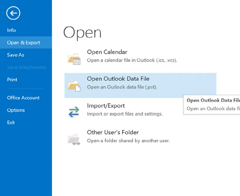 - Εκτελέστε το δικό σαςMS OutlookClient Email και επιλέξτε τοΑνοίξτε το αρχείο δεδομένων OutlookΕπιλογή πρόσβασης στο αρχείο PST Output.