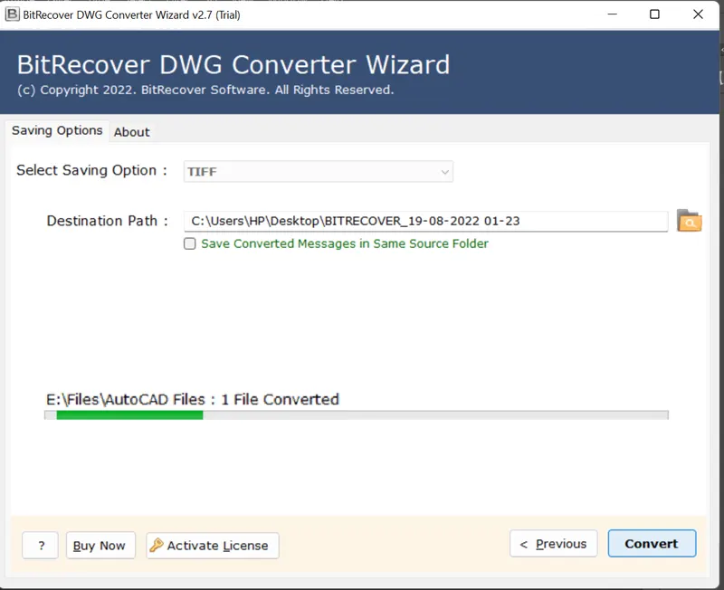 - ΤύποςΜετατρέπωΓια να ξεκινήσετε τη διαδικασία μετατροπής DGN στη μετατροπή TIFF με έκθεση ζωντανής προόδου.