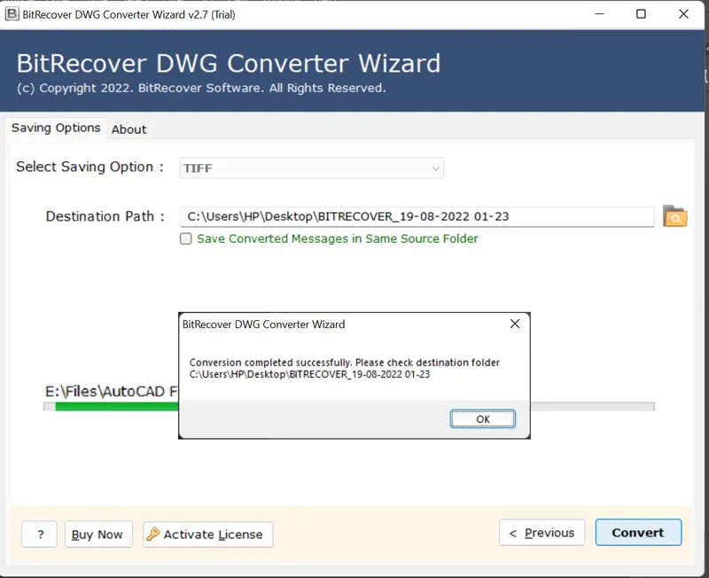 - Η εργασία για τη μετατροπή του DGN σε TIFF ήτανολοκληρώθηκε με επιτυχία. Δείτε το αναδυόμενο μήνυμα ολοκλήρωσης.