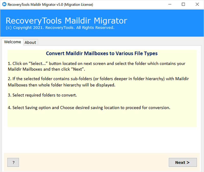 Πρόκειται για ένα εξαιρετικό εργαλείο για την εκτέλεση μετατροπής χωρίς σφάλματα από το MailDir σε μορφή Adobe PDF απλά ακολουθώντας τα λίγα βήματα για να εκτελέσετε τη μετατροπή ηλεκτρονικού ταχυδρομείου που δίνονται παρακάτω.