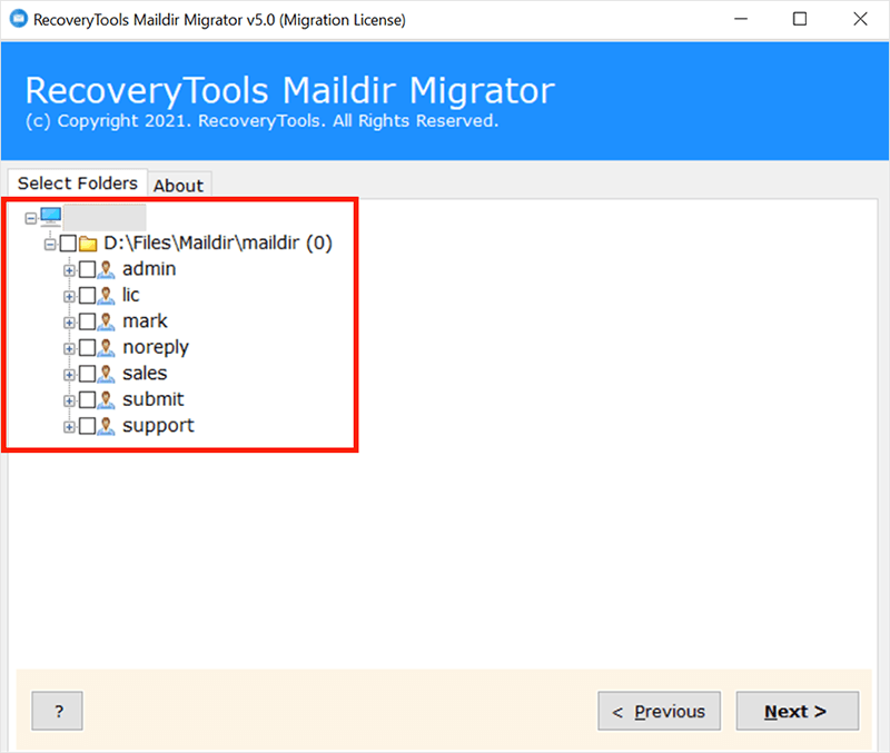- Εξαγωγή μηνυμάτων ηλεκτρονικού ταχυδρομείου από όλους τους καταλόγους και τους υποκαταλόγους του αρχείου Maildir, συμπεριλαμβανομένων των Temp, Cur και New.