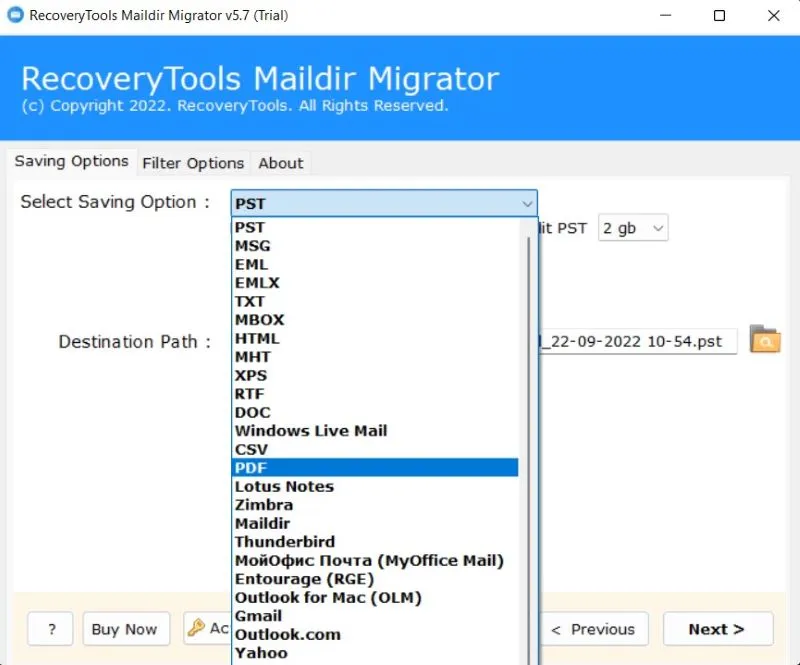 - Μετά από αυτό, επιλέξτε "PDF"Από την επιλογή Select Saving για την εξαγωγή αρχείων MailDir σε μορφή PDF.
