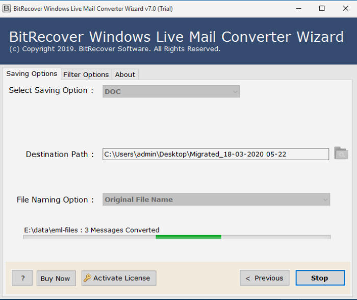 Έχω μεταφέρει Windows Live Mail σε αρχείο Word χρησιμοποιώντας το BitreCover Windows Live Mail στο Word File Converter. Αυτό το εργαλείο διατήρησε όλη την ιεραρχία των φακέλων και μετακόμισε όλα τα μηνύματα ηλεκτρονικού ταχυδρομείου από το WLM σε αρχείο DOC σε λίγα δευτερόλεπτα.