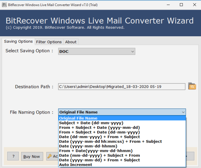 Παρέχει πολλαπλές επιλογές ονομασίας αρχείων:Για την οργάνωση των Windows Live Mail σε δεδομένα αρχείων λέξεων, μπορείτε να επιλέξετε την επιλογή ονομασίας αρχείου. Υπάρχουν περίπου 10+ συμβάσεις ονομασίας αρχείων που μπορείτε να επιλέξετε σύμφωνα με την ανάγκη.
