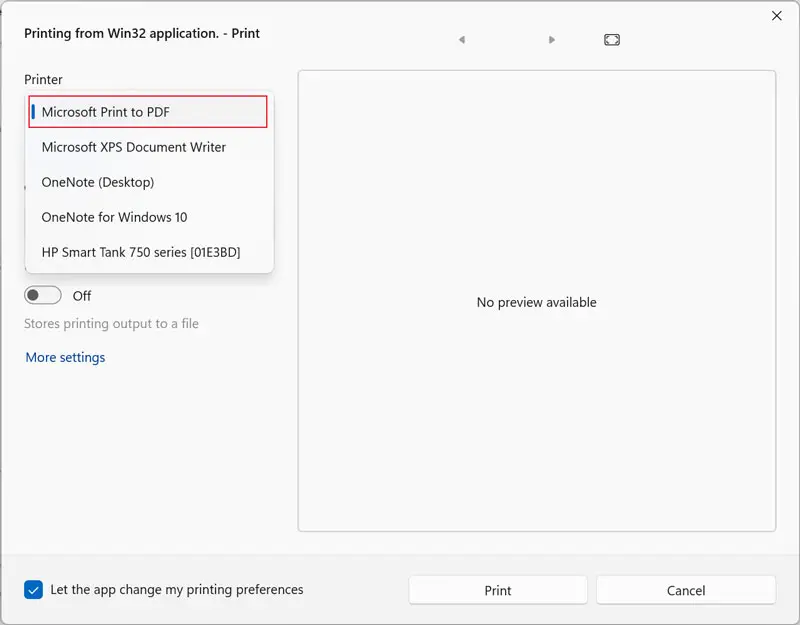 - ΕπιλέγωMicrosoft Print στο PDFεπιλογή ως εκτυπωτής.