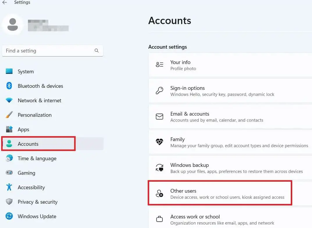 - Πηγαίνετε στην αριστερή πλαϊνή μπάρα και επιλέξτε "Λογαριασμούς", τότε "άλλοι χρήστες" στο δεξιό παράθυρο.