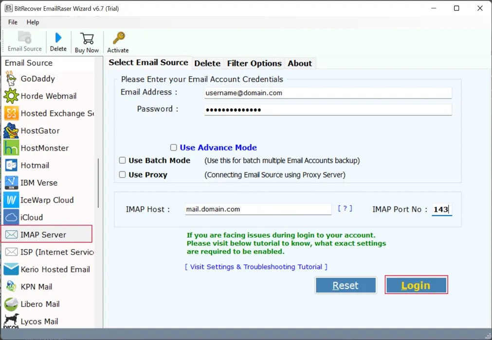 - Πρώτον, εγκαταστήστε και εκτελέστεΛογισμικό Email Email IMAPστο σύστημα. Το λογισμικό θα εμφανίσει τη λίστα των πηγών ηλεκτρονικού ταχυδρομείου στη διεπαφή χρήστη.Επιλέξτε IMAPαπό τη λίστα προέλευσης. Εν συνέχεια,Εισαγάγετε τα διαπιστευτήρια ηλεκτρονικού ταχυδρομείου λογαριασμού IMAPόπως αναγνωριστικό email / κωδικός πρόσβασης και πατήστε τοΣύνδεσηκουμπί.