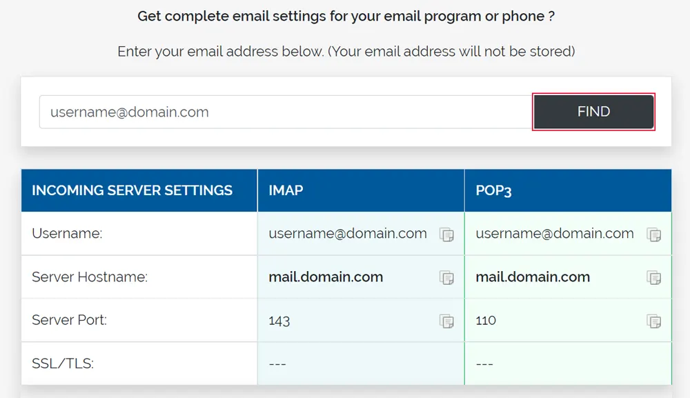 Σημειώστε ότι:Εάν δεν γνωρίζετε τις ρυθμίσεις IMAP του λογαριασμού email σας, μεταβείτε στοhttps://imapsettings.com/.Εισαγάγετε τη διεύθυνση email σας σε ένα συγκεκριμένο πεδίο και κάντε κλικ στο κουμπί Εύρεση. Έτσι, μπορείτε εύκολα να γνωρίζετε τις ρυθμίσεις του λογαριασμού σας IMAP (Πρωτόκολλο πρόσβασης στο Διαδίκτυο.
