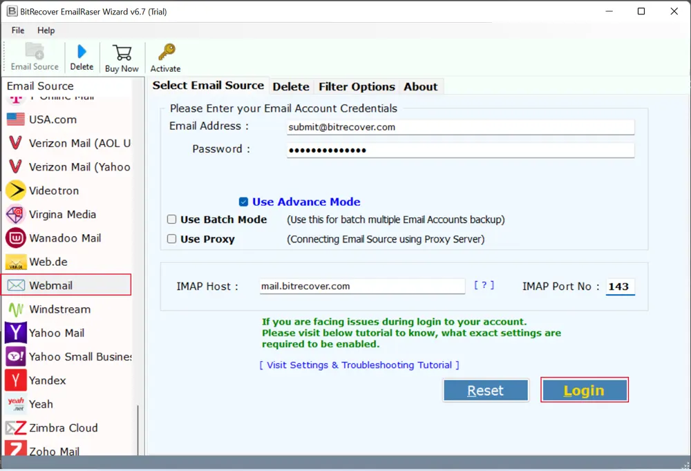 - ΕπιλέγωWebmailΩς πηγή ηλεκτρονικού ταχυδρομείου από το εργαλείο και εισαγάγετε τη διεύθυνση ηλεκτρονικού ταχυδρομείου καθώς και τον κωδικό πρόσβασης. Επίσης, συμπληρώστε το IMAP Host και το IMAP θύρα αριθ. Και κάντε κλικ στο κουμπίμεγάλοδοχείονα συνεχιστεί.