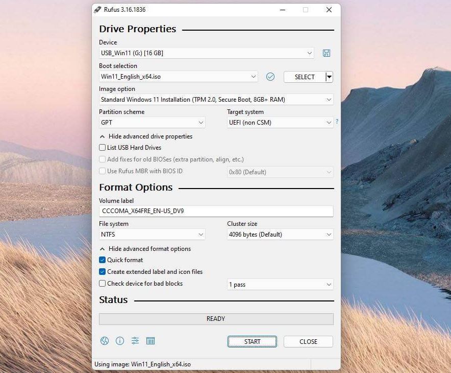Συνιστούμε να εκτελέσετε το Rufus στον υπολογιστή στον οποίο θέλετε να εγκαταστήσετε τα Windows 11. Αυτό επιτρέπει στο Rufus να προετοιμάσει αυτόματα τις σωστές τιμές με βάση τη διαμόρφωση του συστήματός σας.
