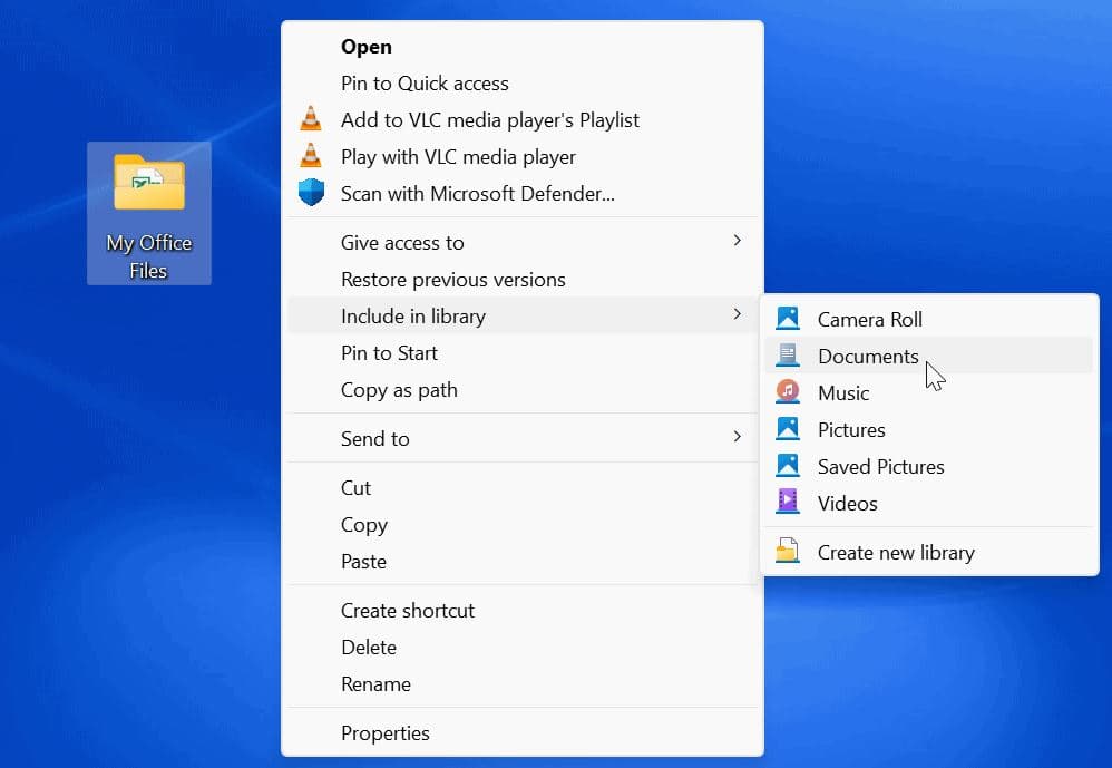 - Επιλέξτε Συμπεριλάβετε στη βιβλιοθήκη από το μενού και επιλέξτε τον κατάλογο που θέλετε να τοποθετήσετε τους φακέλους ή τα αρχεία.