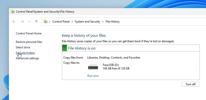 - Στα Windows 10, το ιστορικό αρχείων υποστηρίζει αρχεία σε όλους τους φακέλους που αποτελούν μέρος των βιβλιοθηκών του λογαριασμού χρήστη σας, όπως έγγραφα, μουσική, εικόνες, βίντεο, επιφάνεια εργασίας και OneDrive. Στα Windows 11, το ιστορικό αρχείου υποστηρίζει μόνο τα αρχεία στους φακέλους της επιφάνειας εργασίας και του OneDrive από προεπιλογή. Μπορείτε να προσθέσετε άλλους φακέλους χειροκίνητα αν θέλετε.