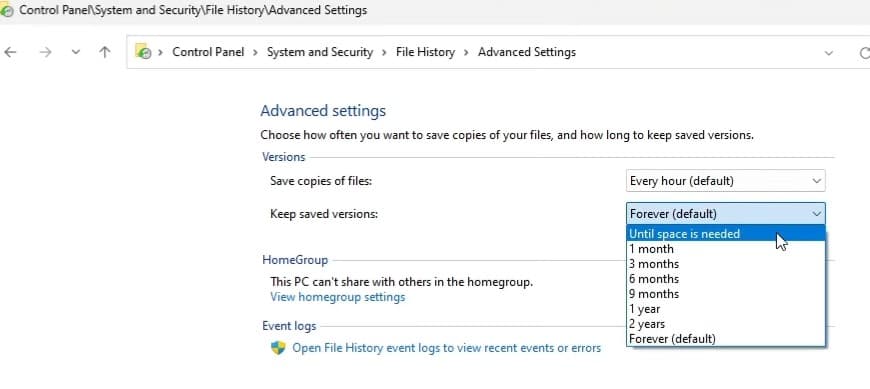 - Κάτω από εκδόσεις, χρησιμοποιήστε το αναπτυσσόμενο μενού δίπλα για να αποθηκεύσετε αντίγραφα αρχείων για να επιλέξετε τη συχνότητα αντιγράφων ασφαλείας.