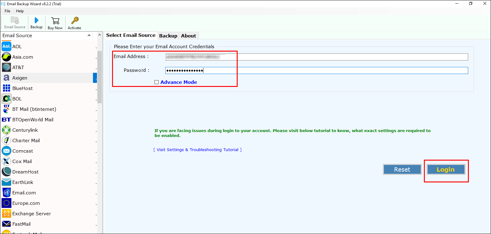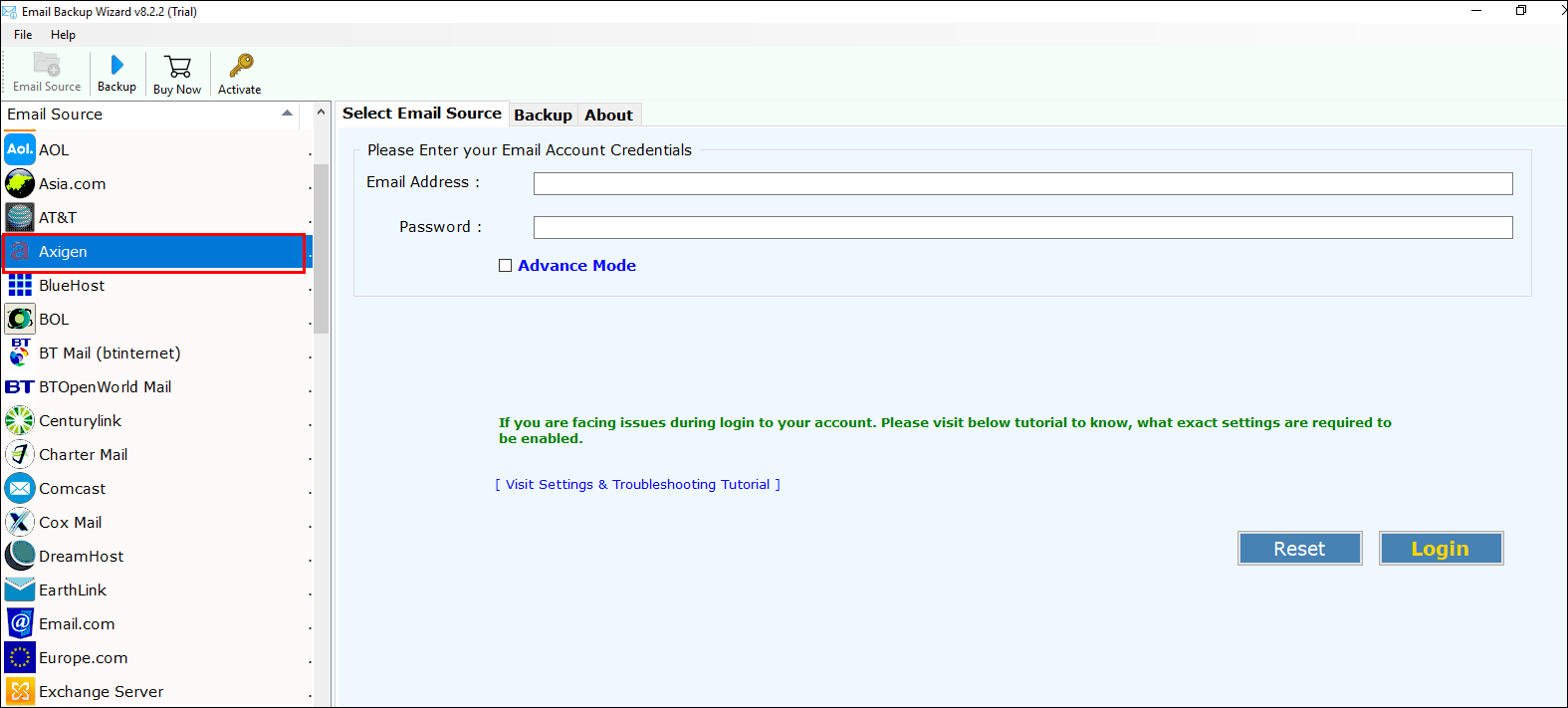 - Επιλέξτε Axigen από την πηγή και εισαγάγετε τα διαπιστευτήρια για σύνδεση.