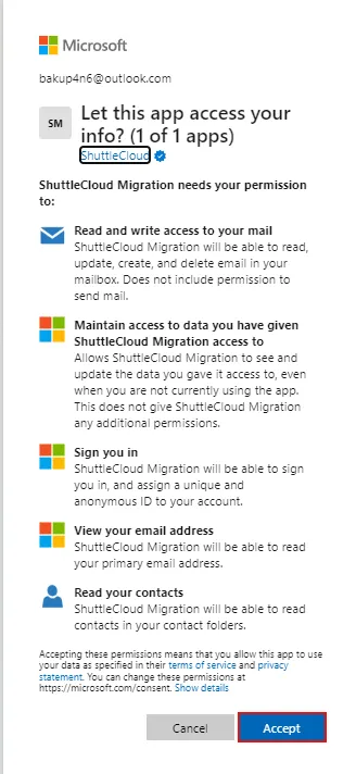 - Μετά από αυτό, η μετανάστευση ShuttleCloud χρειάζεται τα δικαιώματα σας, επιλέξτεΑποδέχομαι.