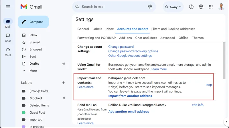 - Τέλος, προσθέτοντας email outlook.com στο Gmail, περιμένετεέως 2 ημέρεςγια να ολοκληρωθεί.