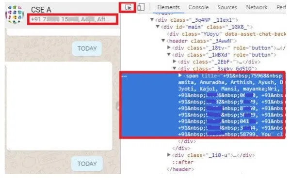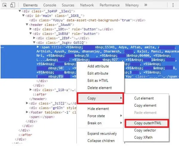 - 9. Αφού βρείτε τις επαφές της ομάδας, πρέπει να τις επιλέξετε και στη συνέχεια να κάνετε δεξί κλικ σε αυτήν την ενότητα. Στη συνέχεια, μπορείτε να επιλέξετε να αντιγράψετε το στοιχείο ή το εξωτερικό HTML των επαφών της ομάδας WhatsApp.