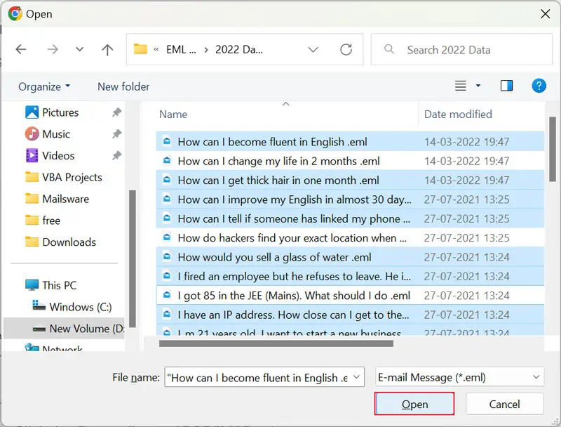 - Επιλέξτε λιγότερα από 10 αρχεία EML από το μηχάνημά σας και πατήστεΑνοιχτόκουμπί.