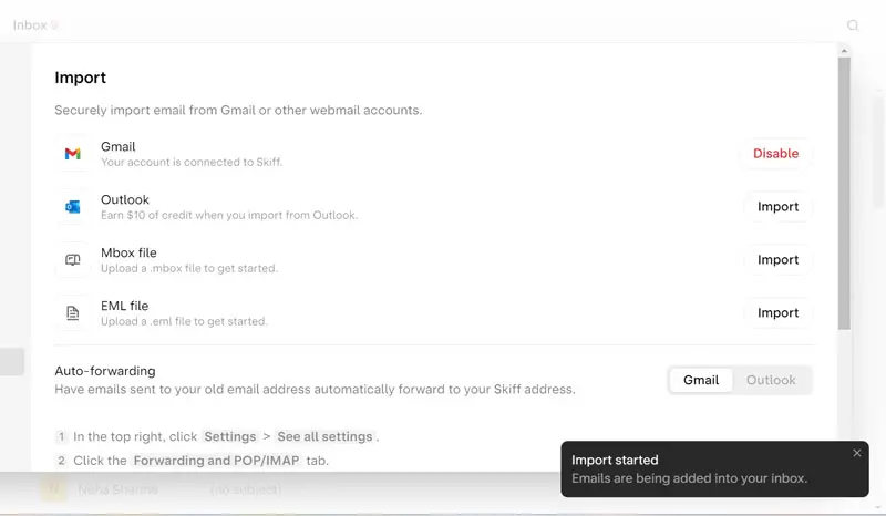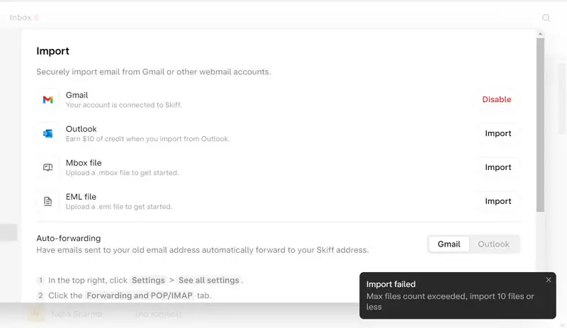 Χρησιμοποιώ την υπηρεσία Skiff Mail για τους τελευταίους 5 μήνες χωρίς κανένα πρόβλημα. Αλλά τώρα που προσπαθώ να εισαγάγω το EML στο Skiff Mail, τότε λαμβάνω ένα μήνυμα σφάλματος όπως "Η εισαγωγή απέτυχε - ο αριθμός των μέγιστων αρχείων υπερβαίνει, εισάγετε 10 αρχεία ή λιγότερο".