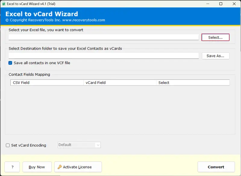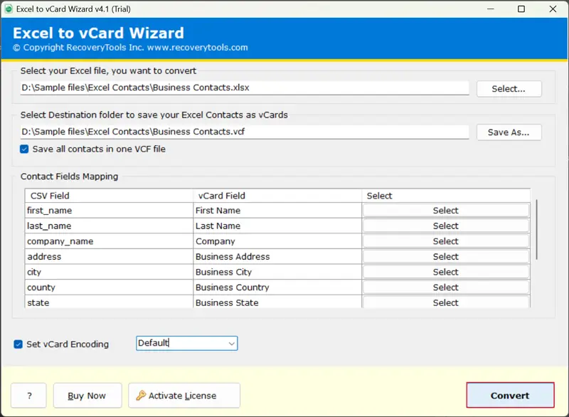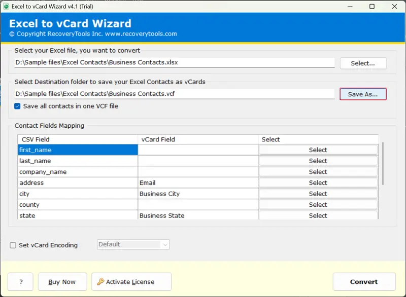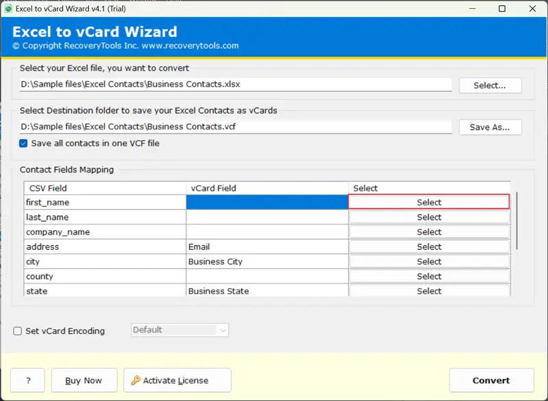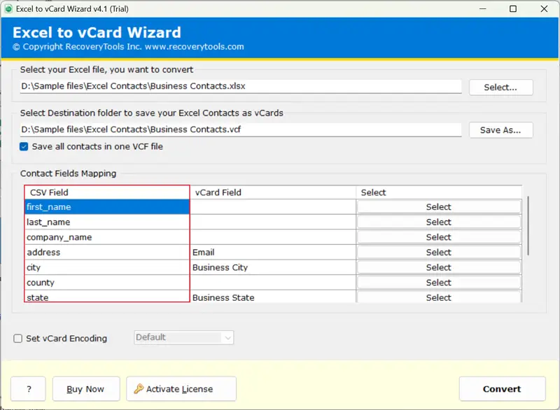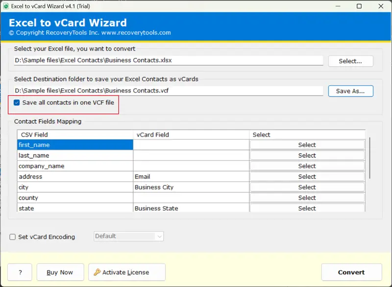- Ελέγξτε τα πεδία επαφής μετά τη χαρτογράφηση πεδίου και κωδικοποιήστε το αρχείο excel σε VCard ελέγχοντας τοΡυθμίστε το κουτί κωδικοποίησης VCARD.