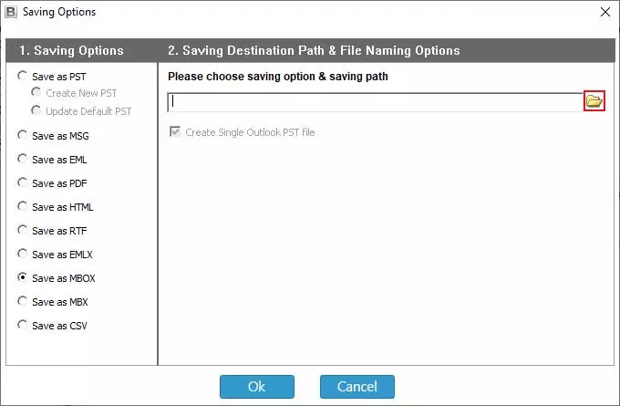 - Πατήστε τοΝτοσιέεικονίδιο και περιήγησηδιαδρομή προορισμούγια την αποθήκευση του προκύπτοντος αρχείου γραμματοκιβωτίου.
