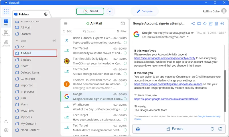 Από την άλλη πλευρά, το BlueMail είναι ένας φιλικός προς το χρήστη πελάτη ηλεκτρονικού ταχυδρομείου που υποστηρίζει πολλούς λογαριασμούς ηλεκτρονικού ταχυδρομείου από διάφορους παρόχους, όπως το Gmail, το Yahoo, το Outlook και πολλά άλλα. Αυτό μπορεί εύκολα να έχει πρόσβαση μέσω πλατφορμών κινητής τηλεφωνίας και επιφάνειας εργασίας. Το BlueMail προσφέρει διάφορα χρήσιμα χαρακτηριστικά όπως η ενσωματωμένη υποστήριξη ημερολογίου, οι προσαρμόσιμες ενέργειες Swipe, τα μηνύματα ασφαλείας για αργότερα κλπ. Παρέχει κρυπτογράφηση από άκρο σε άκρο και υποστηρίζει μια ασφαλή διαδικασία σύνδεσης.