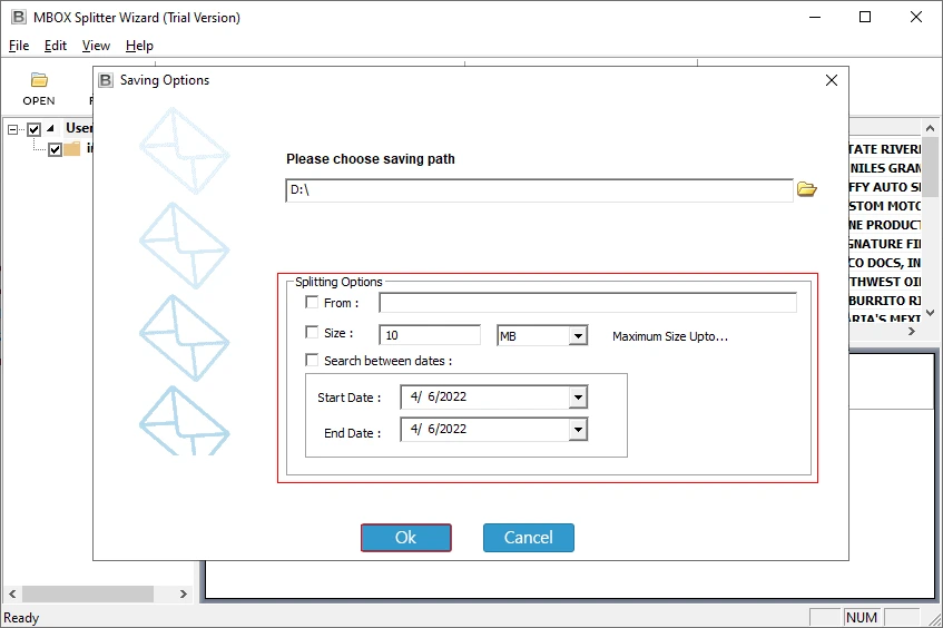 - Ελέγξτε τις πολλαπλές επιλογές διαχωρισμού, όπως από, μέγεθος, μέγιστο μέγεθος, ημερομηνία έναρξης, ημερομηνία λήξης κ.λπ.