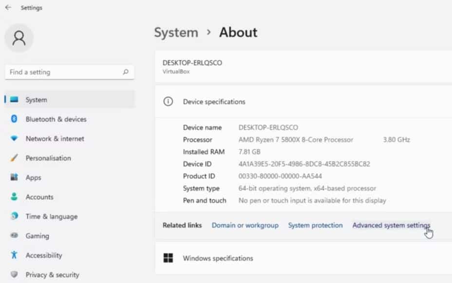 - Κάντε κλικ στο Σύστημα -> Σχετικά, στη συνέχεια κάντε κύλιση προς τα κάτω και κάντε κλικ στις Ρυθμίσεις συστήματος για προχωρημένους.