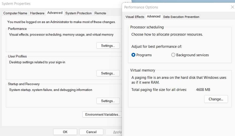 Ένας άλλος τρόπος για να επιταχύνετε τον φορητό υπολογιστή Windows 11 είναι να προσαρμόσετε το μέγεθος του αρχείου σελίδας και τις ρυθμίσεις απόδοσης. Μέγεθος αρχείου σελίδας ήΕικονική μνήμηείναι ένα μέρος του σκληρού σας δίσκου που λειτουργεί ως επέκταση της μνήμης RAM σας. Όταν η μνήμη RAM είναι γεμάτη, τα Windows 11 θα μετακινήσουν ορισμένα από τα δεδομένα από τη μνήμη RAM στην εικονική μνήμη για να ελευθερώσει χώρο. Ωστόσο, εάν η εικονική σας μνήμη είναι πολύ μικρή ή πολύ μεγάλη, μπορεί να επηρεάσει την απόδοση και την ταχύτητα του φορητού υπολογιστή σας.