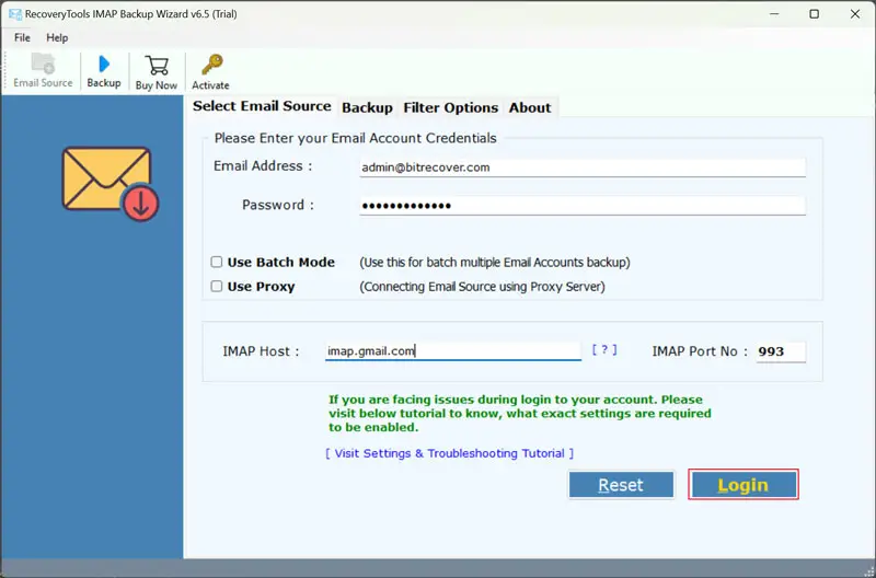 - Εγκαταστήστε το λογισμικόκαι πηγαίνετε στο SELECTΕπιλογή πηγής email. ΕισάγωΠληροφορίες λογαριασμού Intermediaόπως η διεύθυνση ηλεκτρονικού ταχυδρομείου, ο κωδικός πρόσβασης και οι λεπτομέρειες του IMAP.