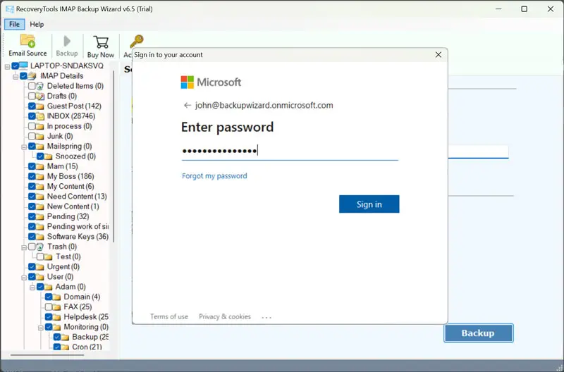 - Αμέσως μετά την κλικ στο αντίγραφο ασφαλείας, θα σας ζητηθεί να εισαγάγετε τον κωδικό πρόσβασης του λογαριασμού Microsoft Office 365 καιΣυνδεθώ.