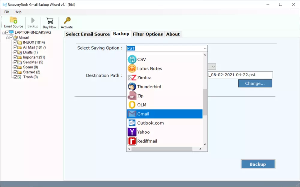 - Μετά από αυτό, το εργαλείο θα φορτώσει γρήγορα όλους τους φακέλους αλληλογραφίας του λογαριασμού σας G Suite. Ελέγξτε τους απαιτούμενους φακέλους email. Τώρα, ο χρήστης πρέπει να επιλέξει το Gmail ως επιλογή αποταμίευσης από τη δεδομένη αναπτυσσόμενη λίστα.