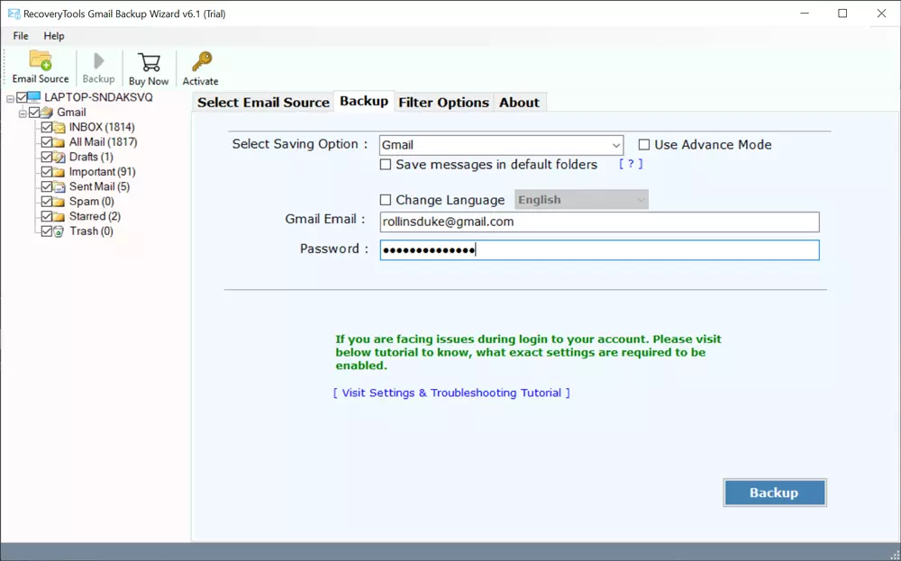 - Εισαγάγετε σωστά όλα τα διαπιστευτήρια σύνδεσης του προσωπικού σας λογαριασμού Google Mail και κάντε κλικ στο κουμπί Backup.