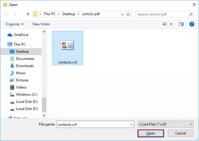 - Στη συνέχεια, μεταβείτε στο αρχείο ή στο φάκελο VCF, επιλέξτε τα και, στη συνέχεια, πατήστε το κουμπί Άνοιγμα.