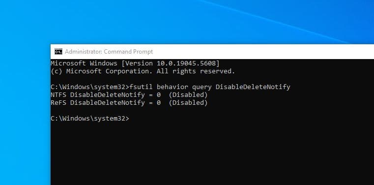 Μετά την εκτέλεση της εντολής, θα πρέπει να λάβετε ένα αποτέλεσμαμηδέν (0),σημαίνει ότι το TRIM είναι ενεργοποιημένο.