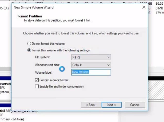 - Ακολουθήστε τις οδηγίες στην οθόνη για να αντιστοιχίσετε ένα γράμμα κίνησης και να διαμορφώσετε το διαμέρισμα (επιλέξτεNTFSγια συμβατότητα των Windows).