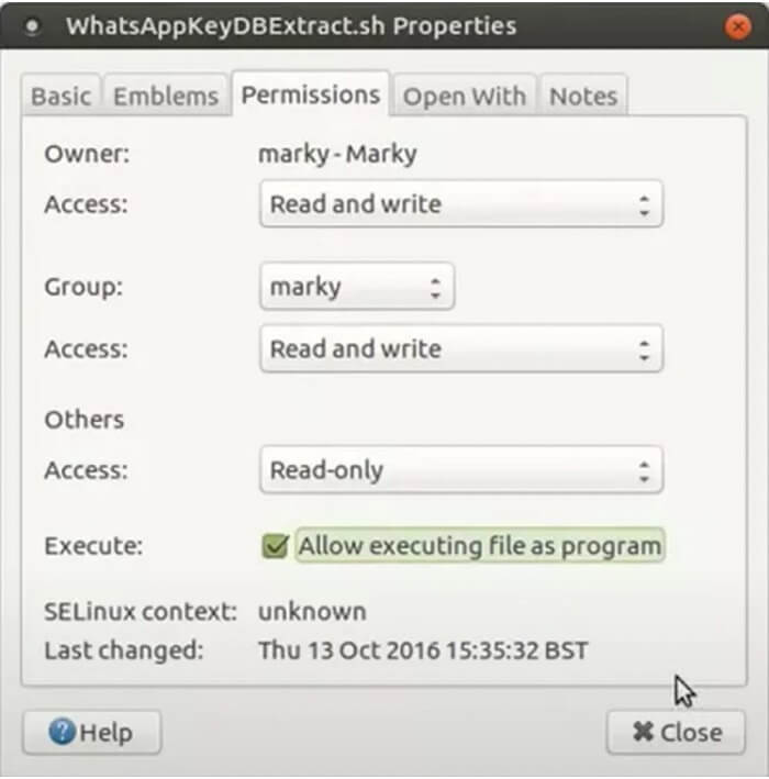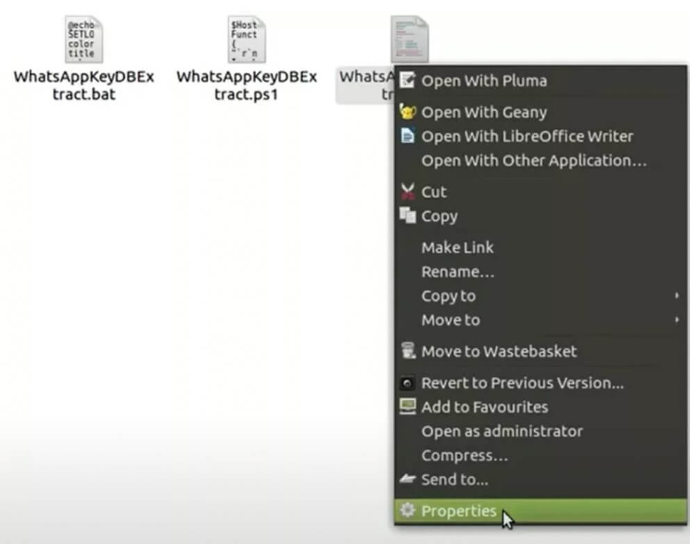 - Ανοίξτε τις ιδιότητες του αρχείου WhatsAppKeyDBExtract.sh.