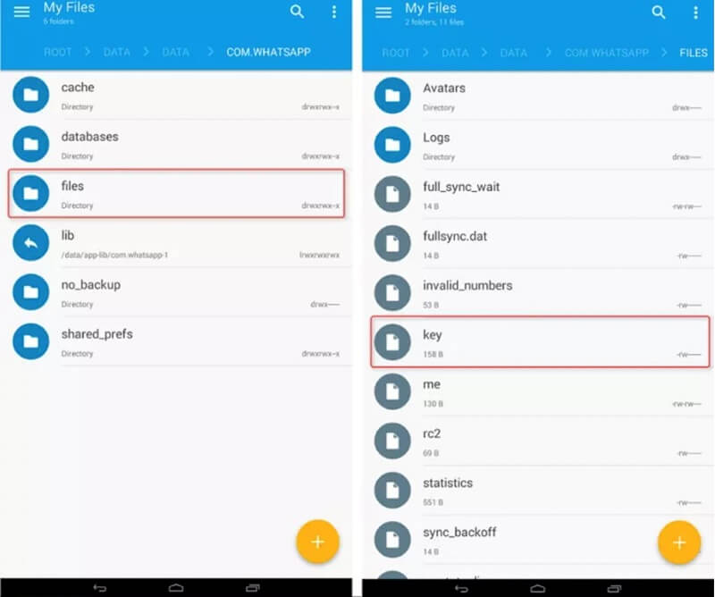 Γι 'αυτό, εντοπίστε το φάκελο com.whatsapp, κάντε κλικ σε αυτό και βρείτε το αρχείο κλειδιού μέσα σε αυτό.