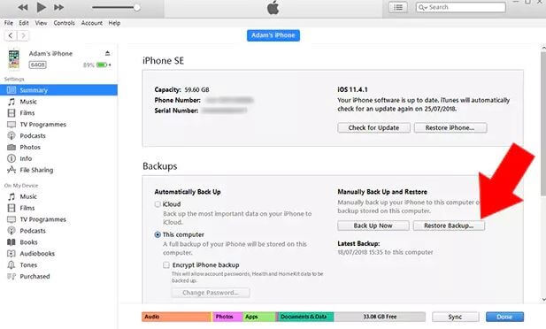 - 2Κάντε κλικ στο εικονίδιο iPhone και επιλέξτε "Επαναφορά αντιγράφων ασφαλείας" από την καρτέλα Σύνοψη.