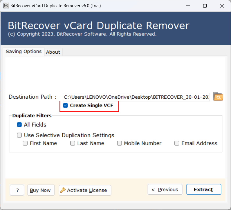 - Το επόμενο βήμα περιλαμβάνει την επιλογή τουΔημιουργία Single VCFεπιλογή για τη συγχώνευση όλων των επαφών σε ένα μόνο αρχείο VCF. Μπορείτε να αγνοήσετε αυτήν την επιλογή για την αποθήκευση μεμονωμένων αρχείων χωρίς αντίγραφα.