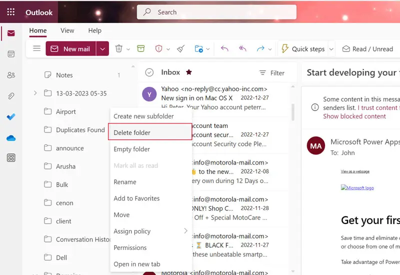- Επιλέξτε τα διπλότυπα μηνύματα ηλεκτρονικού ταχυδρομείου και κάντε κλικ στο κουμπίΔιαγράψτε όλα. Εναλλακτικά, επιλέξτε τα μηνύματα ηλεκτρονικού ταχυδρομείου, κάντε δεξί κλικ και επιλέξτεΔιαγράφω.