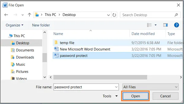 - Περιηγηθείτε σε αρχείο Word VBA που προστατεύεται με κωδικό πρόσβασης, συμπεριλαμβανομένων μακροεντολών και λειτουργικών μονάδων. Πατήστε το κουμπί Άνοιγμα.