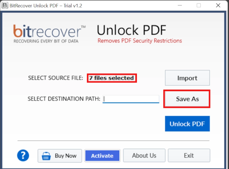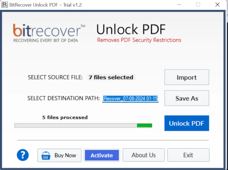 Αυτή είναι η επαγγελματική λύση στοΞεκλειδώστε το PDF με άγνωστο κωδικό πρόσβασης χωρίς κόπο. Χρησιμοποιώντας τους χρήστες λογισμικού PDF Unlocker θα μπορούν να ξεπεράσουν αυτήν την κατάσταση. Επιπλέον, αυτό το εργαλείο μπορεί να επεξεργαστεί αρχεία χύδην σε ένα εξαιρετικά γρήγορο και ασφαλές περιβάλλον. Δεύτερον, αυτό το βοηθητικό πρόγραμμα θα καταργήσει πλήρως τον κωδικό πρόσβασης από το PDF χωρίς κωδικό πρόσβασης άδειας. Τώρα ας αποκαλύψουμε τον πραγματικό οδηγό εργασίας της χρησιμότητας. Ο χρήστης πρέπει να ακολουθήσει αυτά τα απλά βήματα μέσω των οποίων ο χρήστης θα είναι σε θέση να ξεκλειδώσει εύκολα τον άγνωστο κωδικό πρόσβασης PDF.