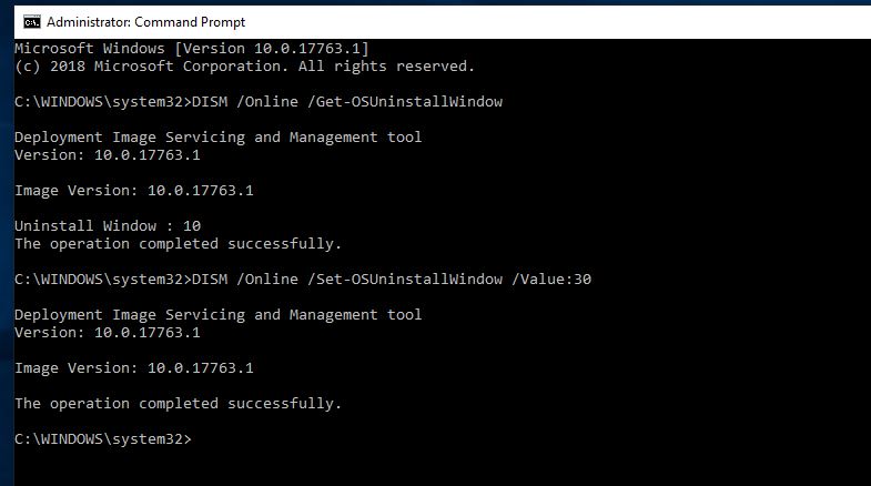 - Στη συνέχεια, χρησιμοποιήστε την εντολήDISC /ONLINE /SET-OSUNINSTALLWINDOW /VALUE: 30Για να προσαρμόσετε και να ρυθμίσετε τον αριθμό των ημερών επαναφοράς για τον υπολογιστή σας