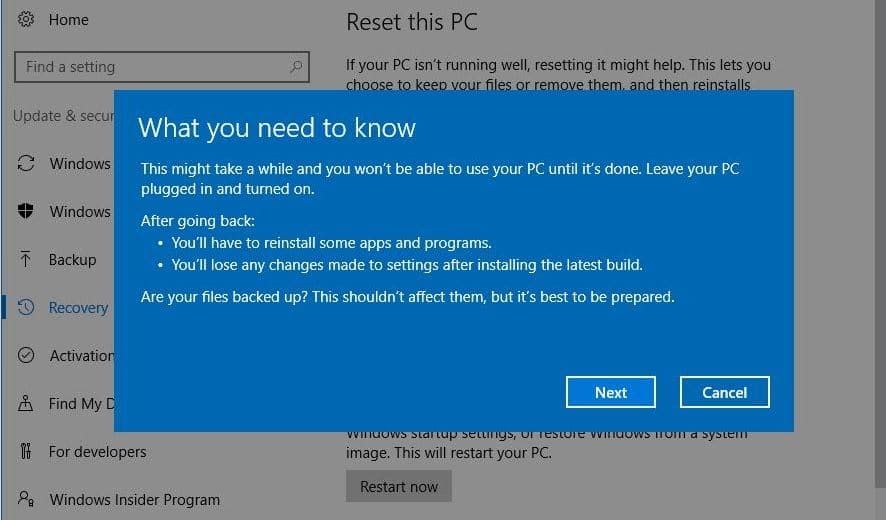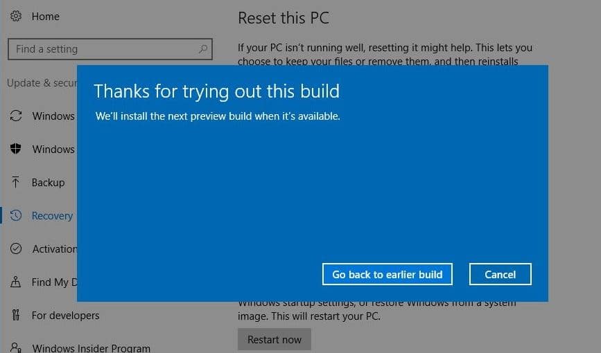 Λάβετε υπόψη, εάν επιστρέψετε σε μια προηγούμενη κατασκευή, ίσως χρειαστεί να επανεγκαταστήσετε ορισμένες εφαρμογές και προγράμματα και θα χάσετε οποιεσδήποτε αλλαγές που κάνατε στις ρυθμίσεις μετά την εγκατάσταση της πρόσφατης ενημέρωσης των χαρακτηριστικών των Windows. Θα σας ενημερωθείτε για να δημιουργήσετε αντίγραφα ασφαλείας των αρχείων σας ως προφύλαξη