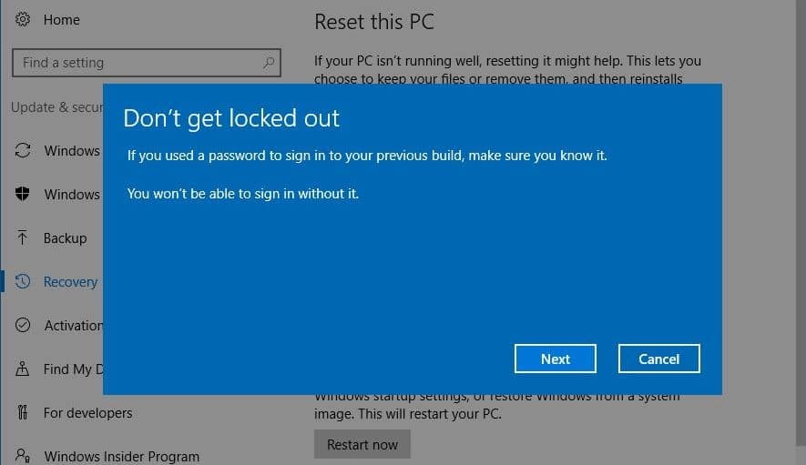 - Όταν κάνετε κλικ στο επόμενο, θα σας οδηγήσει σε καθοδήγηση, θα χρειαστείτε τον κωδικό πρόσβασης που χρησιμοποιήσατε για να συνδεθείτε στην προηγούμενη έκδοση των Windows 10.
