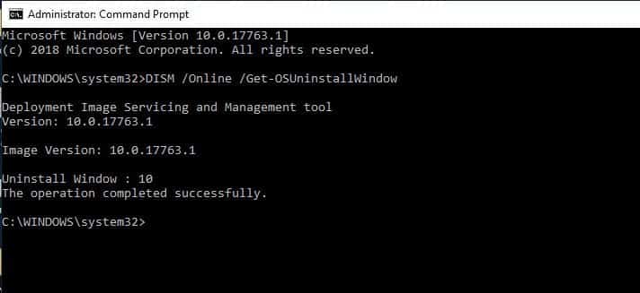 - Πληκτρολογήστε την εντολήΑπόρριψη /online /get-osuninstallwindowΓια να ελέγξετε τον αριθμό των ημερών επαναφοράς (από προεπιλογή 10 ημέρες) που ορίζονται επί του παρόντος στον υπολογιστή σας.