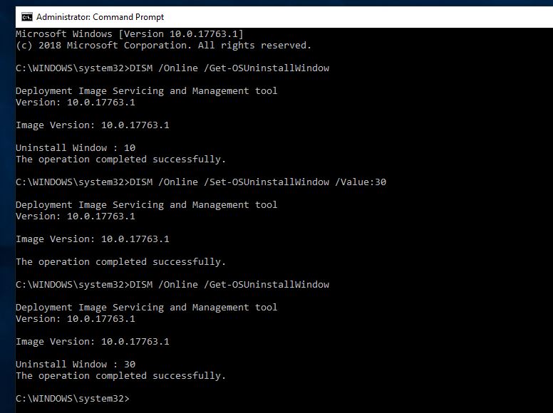 - Τώρα πληκτρολογήστε ξανάΑπόρριψη /online /get-osuninstallwindowΚαι ελέγξτε αυτή τη φορά παρατηρείτε ότι ο αριθμός των ημερών επαναφοράς άλλαξε σε 30 ημέρες όπως φαίνεται παρακάτω εικόνα.