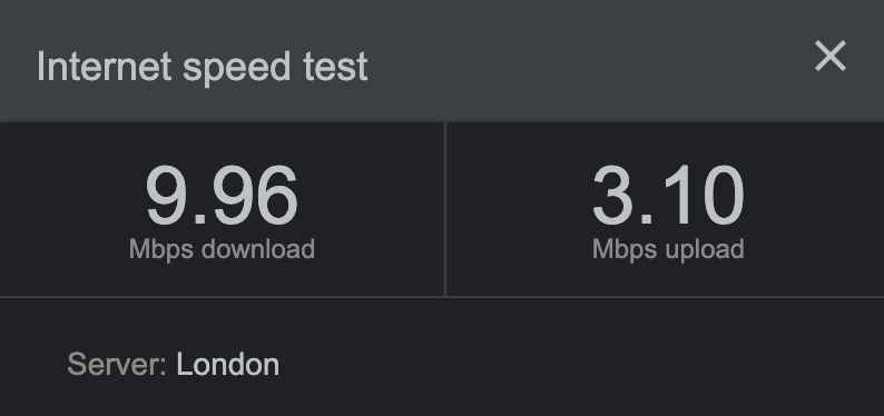 Όταν συνδεθώ με τον διακομιστή του Hola του Λονδίνου, οι ταχύτητες λήψης ήταν μικρότερες από τις βέλτιστες μόνο σε 9,96 Mbps. Με αυτό το ρυθμό, θα ήταν δύσκολο να διατηρηθεί μια σταθερή σύνδεση κατά τη ροή ή τη λειτουργία εφαρμογών υψηλής ζήτησης.